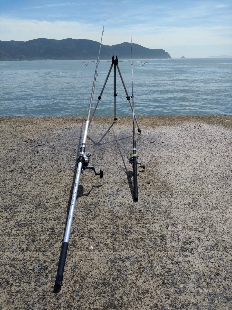 小休止をはさみ、漁港内カレイに望みを持ちつつ竿3本設置。
